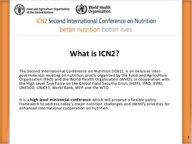 The Second International Conference on Nutrition (ICN2) is an inclusive inter-governmental meeting on nutrition jointly organized by the Food and Agriculture Organization (FAO) and the World Health Organisation(WHO)