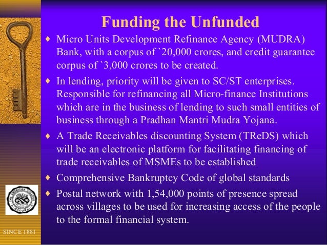 In his 2015-16 Budget speech, Finance Minister Arun Jaitley had proposed the Micro Units Development Refinance Agency (MUDRA) with a corpus of Rs 20,000 crore, and credit guarantee corpus of Rs 3,000 crore