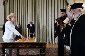 Greece's Supreme top Court judge Vassiliki Thanou (L) stands in front of President Prokopis Pavlopoulos (R) during her swearing in ceremony