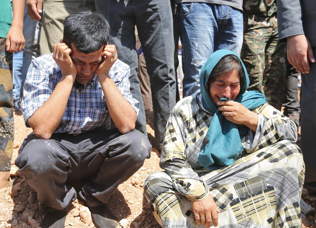 Abdullah Kurdi, father of Aylan, three, and Galip, five, and husband of Rahen Kurdi, 27, who drowned after their boat sank en route to the Greek islands in the Aegean Sea, mourns during funeral of his family in the Syrian border town of Kobani (Ayn al-Arab) on September 4, 2015