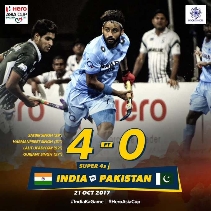 A dominant India continued their unbeaten run in the tournament and thrashed arch-rivals Pakistan 4-0 to sail into the final of the 10th men’s Asia Cup hockey tournament in Dhaka on Saturday Oct 21,2017