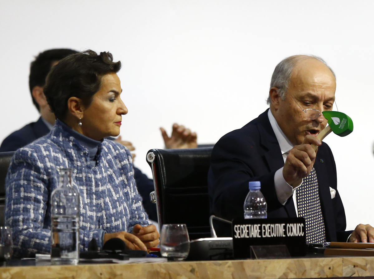 French Foreign Minister and president of the COP21 Laurent Fabius uses to hammer to to mark the adoption of the agreement while United Nations climate chief Christiana Figueres looks on during the final conference at the COP21, the United Nations conference on climate change, in Le Bourget, north of Paris, Saturday, Dec.12, 2015