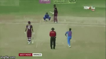 Holder came dancing down the track and tried to hit a Kuldeep Yadav delivery out of the park, but ended up missing the ball completely. Dhoni caught the ball and waited for Holder to make a move and then in slow motion removed the bails as the Windies skipper had already given up.